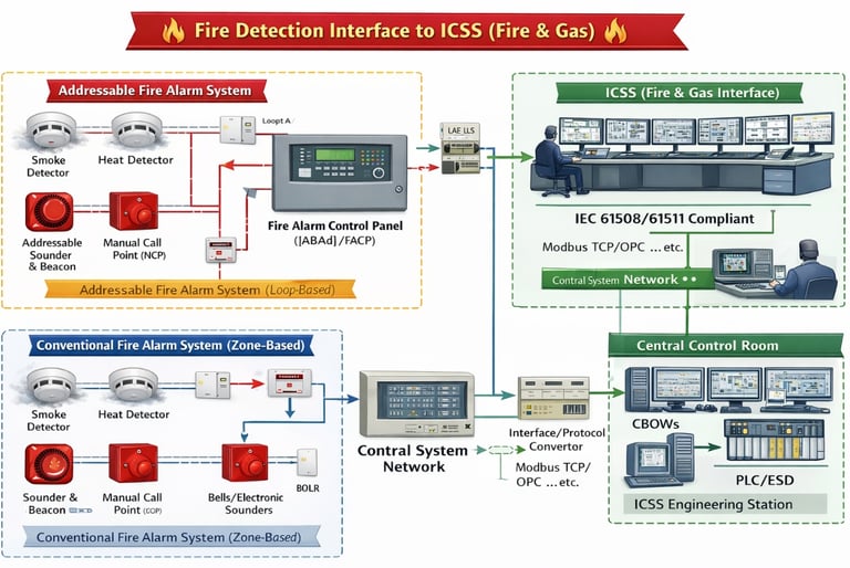 Fire and Gas detection forms a critical safety layer within ICSS/SCADA, providing early hazard identification and automated response in unmanned or harsh environments.