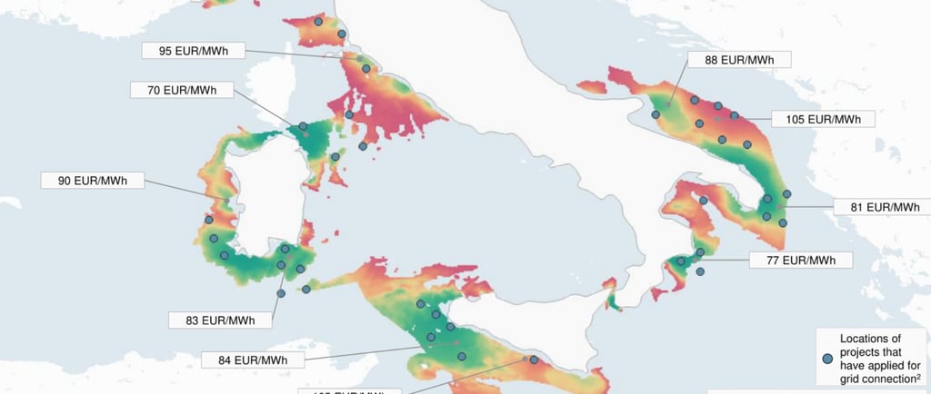 Italy possesses significant potential for offshore wind energy, particularly floating technologies adapted to the deep waters of the Mediterranean Sea. However, as of mid-December 2025, development remains stalled due to ongoing bureaucratic and regulatory challenges. A 2024 government decree established incentives for 3.8 GW of capacity by 2028 through competitive auctions, but these auctions have not yet been launched, delaying billions in potential investments [1][2].