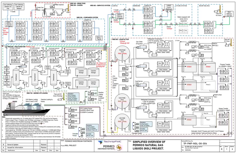 The Permico Midstream Partners project developed an integrated natural gas liquids (NGL) system, transporting Y-grade feedstock from West Texas to export markets via pipelines, fractionation, liquefaction, and marine offloading. The system was designed in phases to scale with demand.