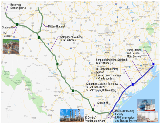 Simpático Pipeline: 600 km (373 miles), 16-inch diameter. Carries high-purity products to East Texas Gas Hub near Mont Belvieu. Includes 2 pumping/pigging stations.